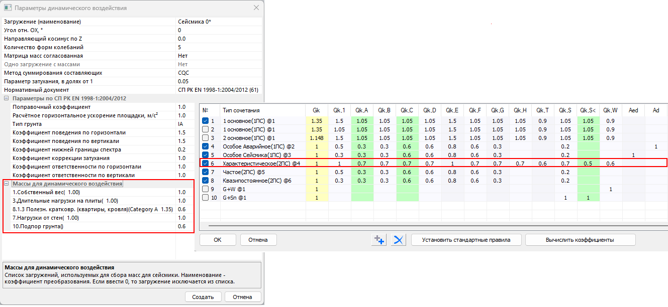 Для сейсмического воздействия (модуль 61) по СП РК EN 1998-1:2004/2012 со спектром из НТП РК 08-01.1-2017 можно сразу задать все параметры, включая способ комбинирования форм колебаний – CQC, и параметр затухания к нему (по умолчанию 0.05).