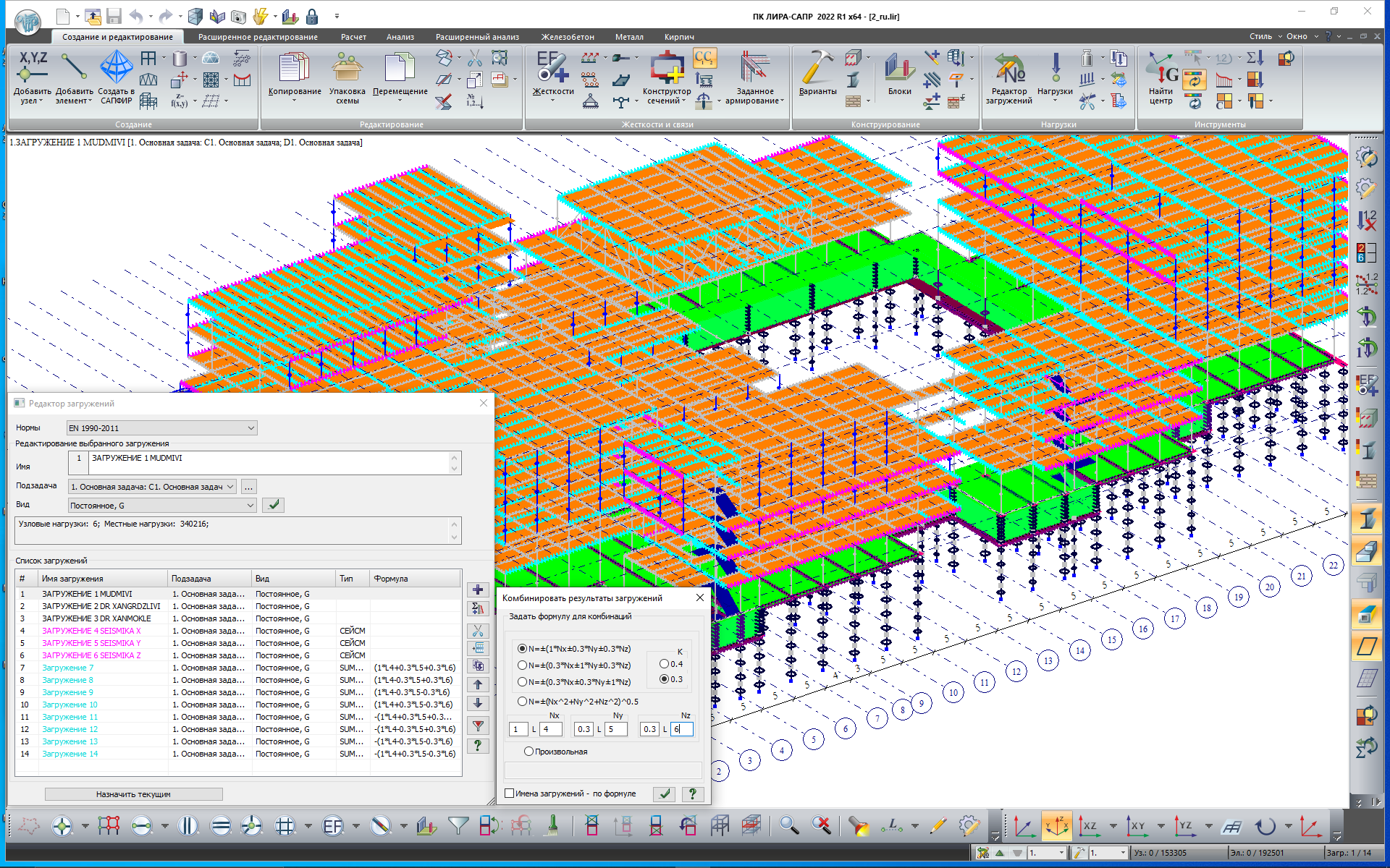 В LIRA-FEM также реализована возможность создания новых загружений как комбинации результатов расчета произвольного набора других загружений. Для такого комбинирования пользователь формирует в «Редакторе загружений» мнемонические формулы, где в качестве компонент используются ссылки на существующие номера загружений, задаются коэффициенты к этим компонентам и определяются математические операции над ними. Сформированные загружения «по формуле» могут быть использованы при формировании РСН/РСУ и участвовать в конструктивном расчете. Одним из примеров необходимости такого комбинирования результатов от разных загружений является требование учета многокомпонентности сейсмических воздействий при расчете линейно-спектральным методом, а также аналогичные требования ряда национальных строительных норм стран Европы (см. например, EuroCode 8 «Design of structures for earthquake resistance», СП РК 2.03-30-2017 «Строительство в сейсмических районах Республики Казахстан»).