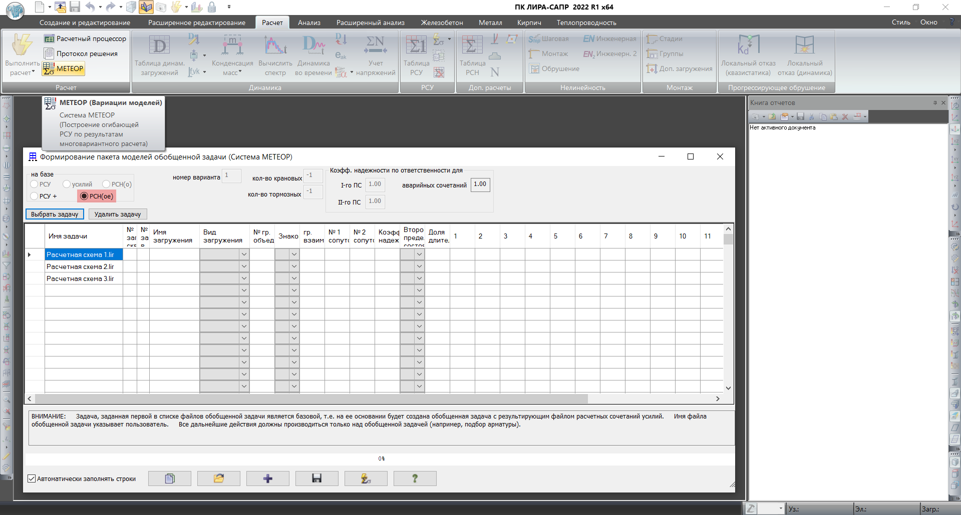 Для норм СП PK EN 1990:2002+A1:2005/2011 реализована возможность использовать систему “МЕТЕОР” (МЕТод Единого Обобщенного Результата), предназначенную для объединения результатов расчета нескольких расчетных схем с одинаковой топологией в единый обобщенный результат. В процессе объединения выполняется унификация результатов РСН(о) – выбор для всех сечений из всех задач таких РСН(о), которые вызывают экстремальное значение каждого критерия. При этом все РСН(о) по соответствующим критериям автоматически становятся взаимоисключающими.