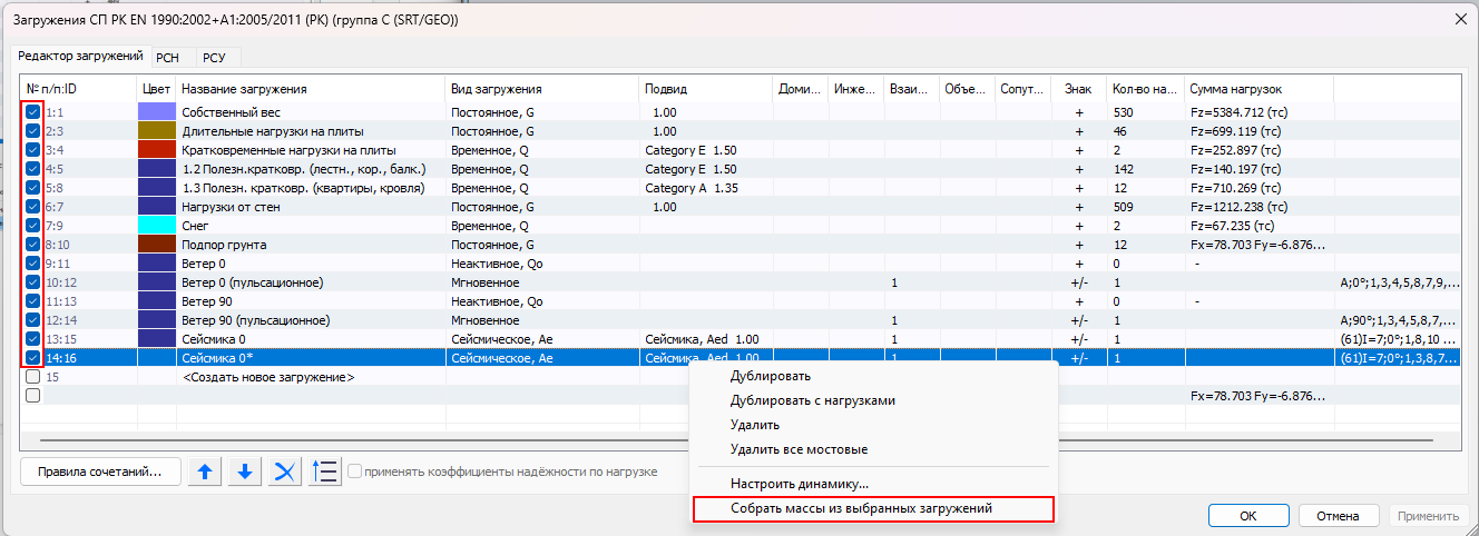 Если добавлялись какие-то загружения уже после задания динамического воздействия, то правой клавишей из контекстного меню можно обновить список загружений для масс. При этом учитываются все загружения отмеченные галочками в первой колонке таблицы (автоматически исключаются загружения «ветер», «сейсмика», «аварийные», даже если галочки на них тоже включены).